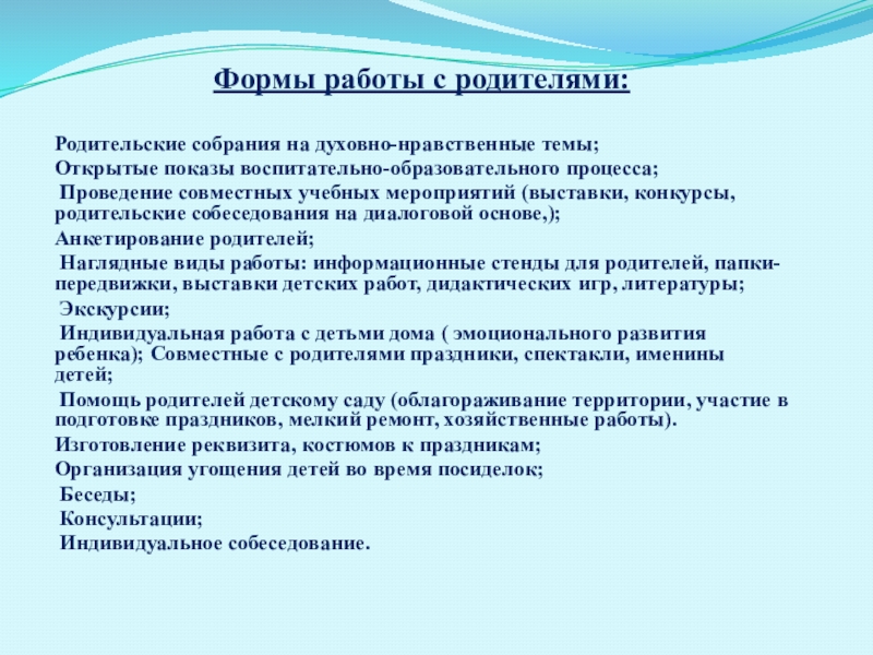Наглядные виды работы: информационные стенды для родителей, папки-передвижки, выставки детских работ, дидактических игр, литературы;