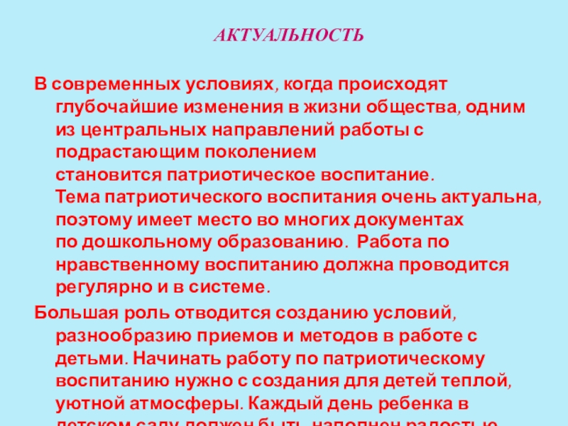 одним из центральных направлений работы с подрастающим поколением становится патриотическое воспитание. Тема патриотического воспитания очень актуальна, поэтому имеет место во многих документах по дошкольному образованию. Работа по нравственному воспитанию должна проводится регулярно и в системе.