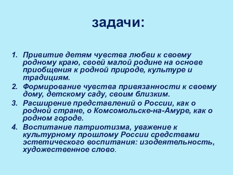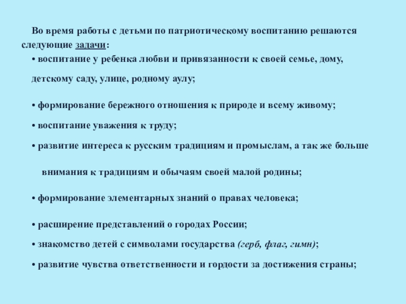 Во время работы с детьми по патриотическому воспитанию решаются следующие задачи: