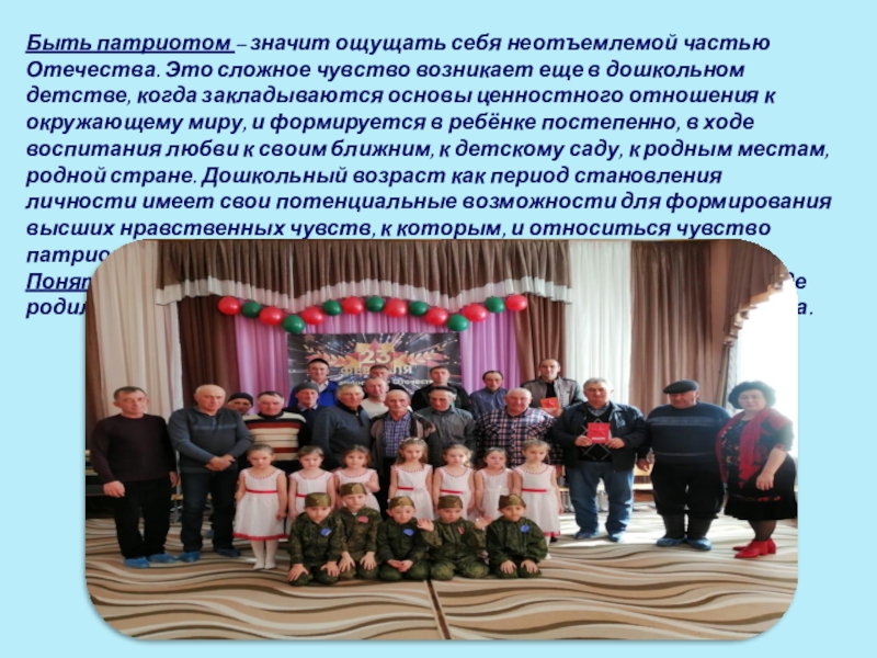 Слайд 8Быть патриотом – значит ощущать себя неотъемлемой частью Отечества. Это сложное