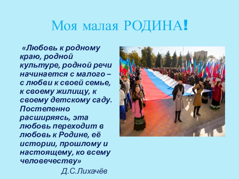 родной речи начинается с малого – с любви к своей семье, к своему жилищу, к своему детскому саду. Постепенно расширяясь, эта любовь переходит в любовь к Родине, её истории, прошлому и настоящему, ко всему человечеству»