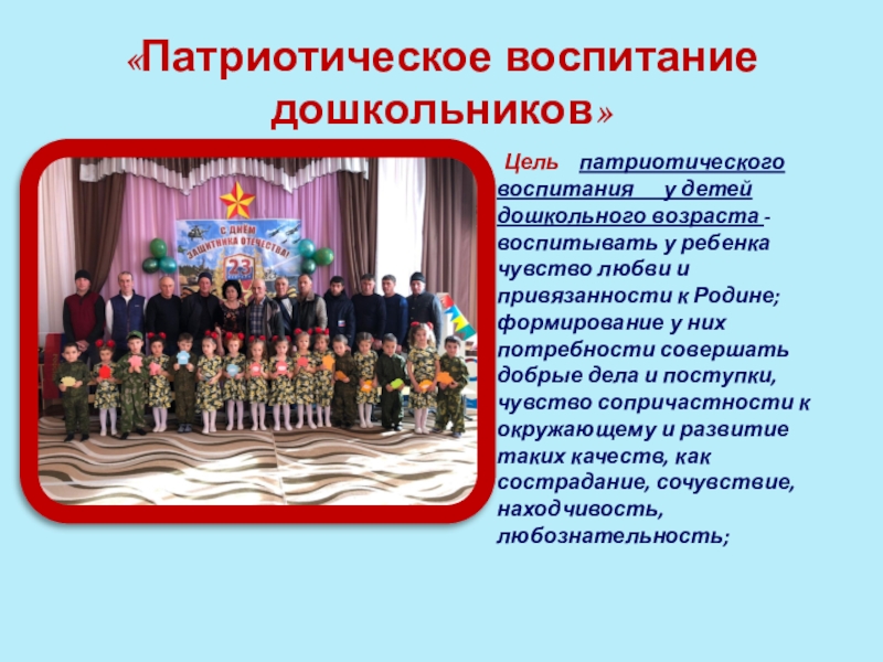 у детей дошкольного возраста - воспитывать у ребенка чувство любви и привязанности к Родине; формирование у них потребности совершать добрые дела и поступки, чувство сопричастности к окружающему и развитие таких качеств, как сострадание, сочувствие, находчивость, любознательность;