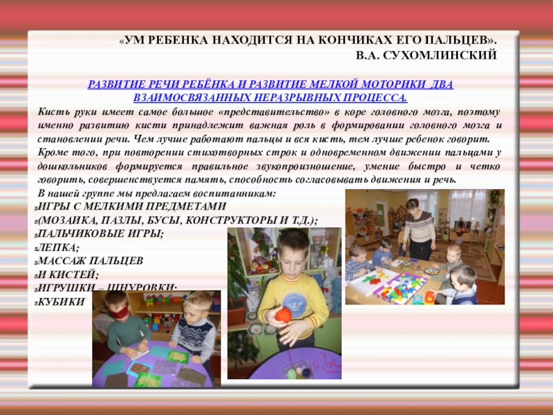 РАЗВИТИЕ РЕЧИ РЕБЁНКА И РАЗВИТИЕ МЕЛКОЙ МОТОРИКИ ДВА ВЗАИМОСВЯЗАННЫХ НЕРАЗРЫВНЫХ ПРОЦЕССА.