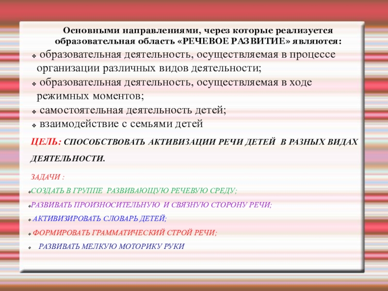 ЦЕЛЬ: СПОСОБСТВОВАТЬ АКТИВИЗАЦИИ РЕЧИ ДЕТЕЙ В РАЗНЫХ ВИДАХ ДЕЯТЕЛЬНОСТИ.