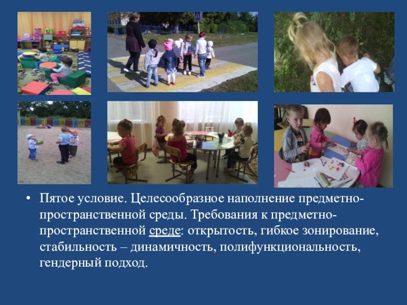 Пятое условие. Целесообразное наполнение предметно-пространственной среды. Требования к предметно-пространственной среде: