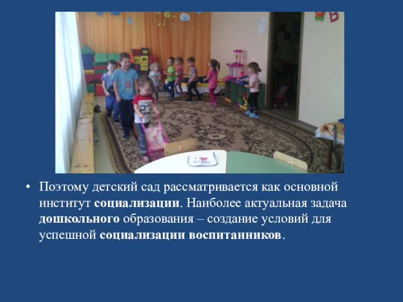 Слайд 4Поэтому детский сад рассматривается как основной институт социализации. Наиболее актуальная задача