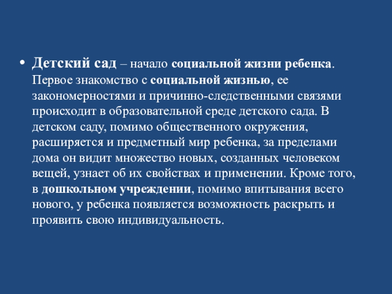 жизнью, ее закономерностями и причинно-следственными связями происходит в образовательной среде детского сада. В детском саду, помимо общественного окружения, расширяется и предметный мир ребенка, за пределами дома он видит множество новых, созданных человеком вещей, узнает об их свойствах и применении. Кроме того, в дошкольном учреждении, помимо впитывания всего нового, у ребенка появляется возможность раскрыть и проявить свою индивидуальность.