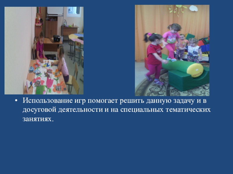 Слайд 25Использование игр помогает решить данную задачу и в досуговой деятельности и