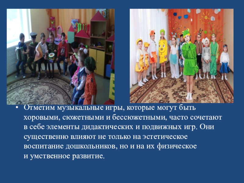 Слайд 21Отметим музыкальные игры, которые могут быть хоровыми, сюжетными и бессюжетными, часто сочетают