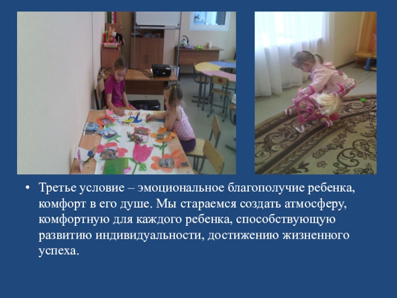 Слайд 9Третье условие – эмоциональное благополучие ребенка, комфорт в его душе. Мы