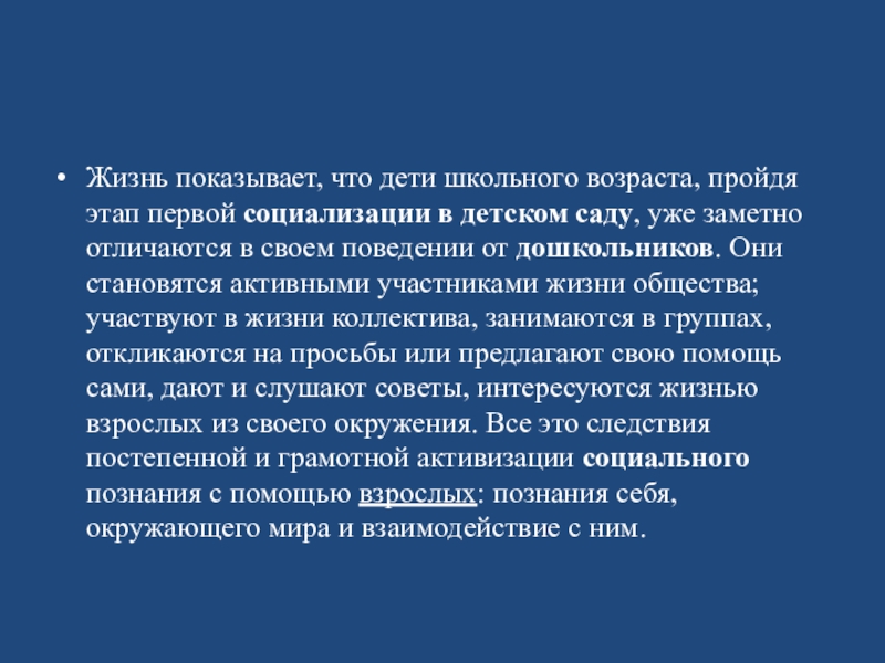 Слайд 27Жизнь показывает, что дети школьного возраста, пройдя этап первой социализации в
