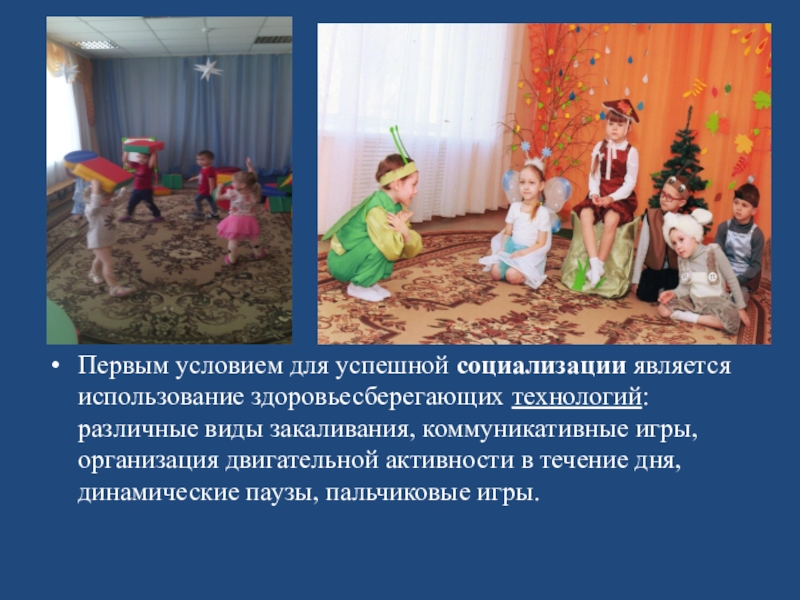 Слайд 5Первым условием для успешной социализации является использование здоровьесберегающих технологий: различные виды