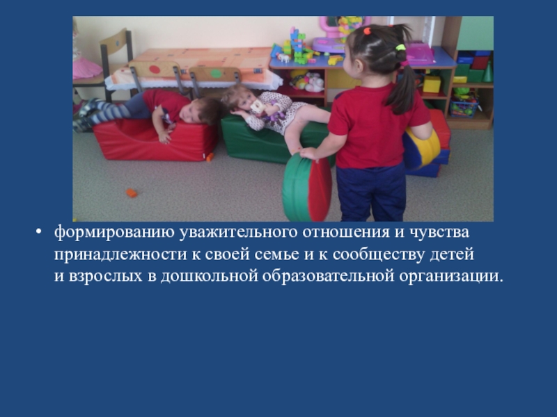 Слайд 17формированию уважительного отношения и чувства принадлежности к своей семье и к сообществу детей и взрослых