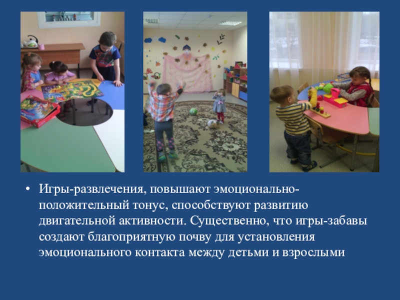 Слайд 22Игры-развлечения, повышают эмоционально- положительный тонус, способствуют развитию двигательной активности. Существенно, что