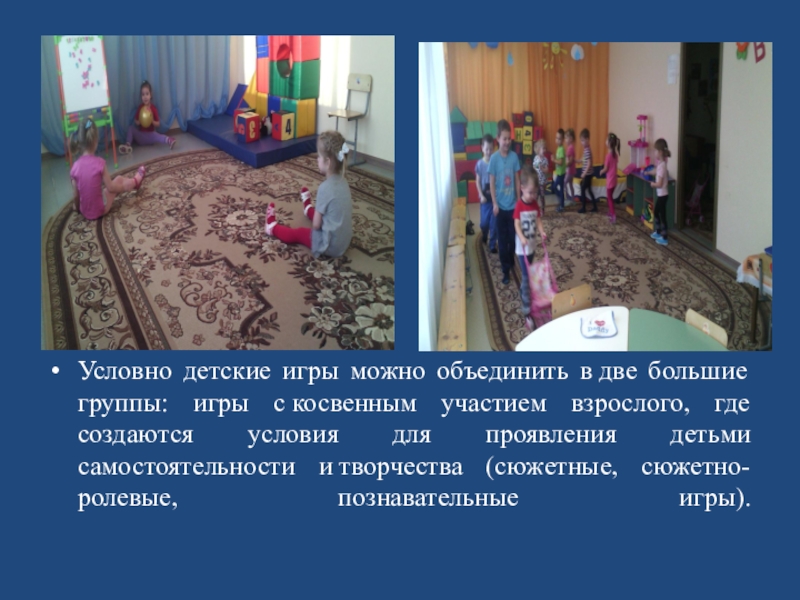 Слайд 18Условно детские игры можно объединить в две большие группы: игры с косвенным участием