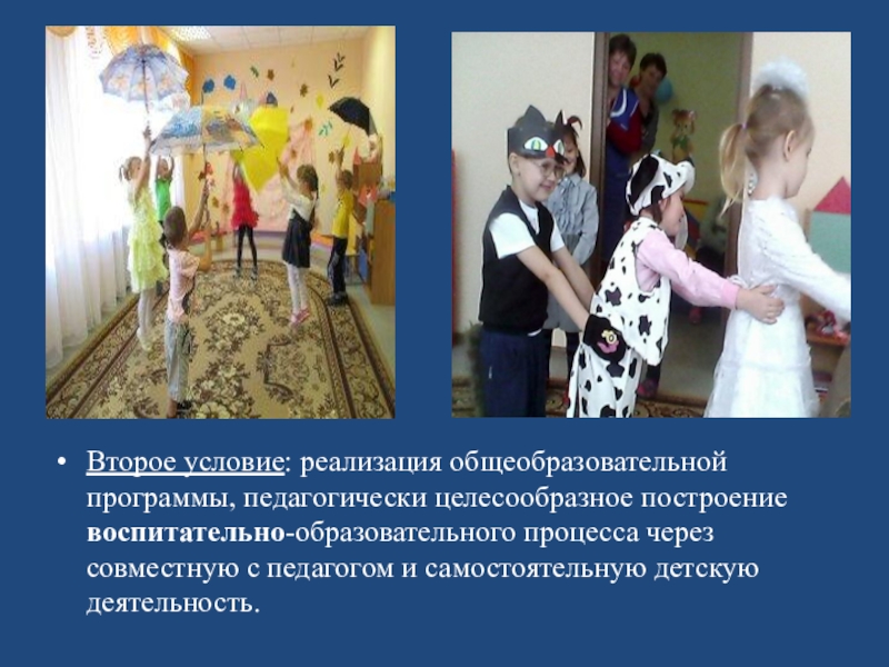 Слайд 6Второе условие: реализация общеобразовательной программы, педагогически целесообразное построение воспитательно-образовательного процесса через