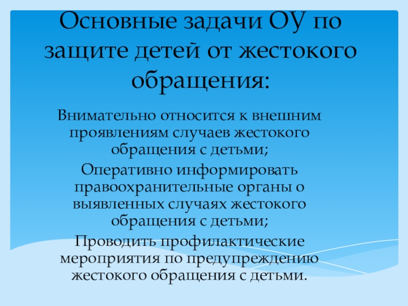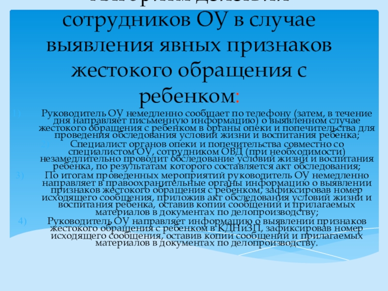 Руководитель ОУ немедленно сообщает по телефону (затем, в течение дня направляет письменную информацию) о выявленном случае жестокого обращения с ребенком в органы опеки и попечительства для проведения обследования условий жизни и воспитания ребенка;