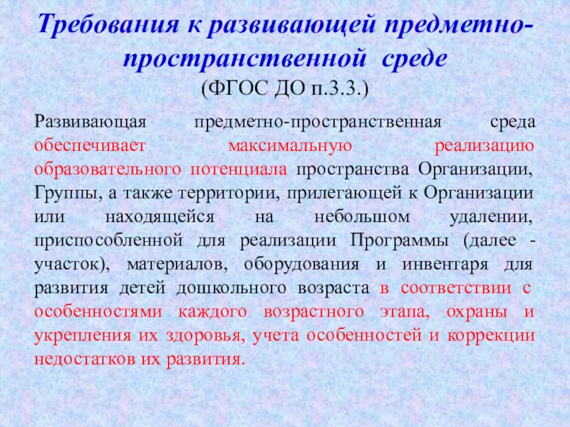 реализацию образовательного потенциала пространства Организации, Группы, а также территории, прилегающей к Организации или находящейся на небольшом удалении, приспособленной для реализации Программы (далее - участок), материалов, оборудования и инвентаря для развития детей дошкольного возраста в соответствии с особенностями каждого возрастного этапа, охраны и укрепления их здоровья, учета особенностей и коррекции недостатков их развития.