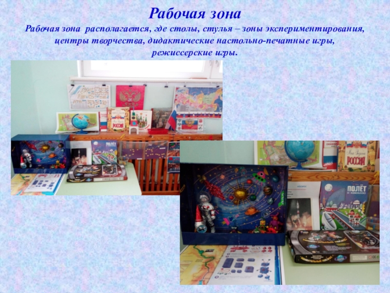 Слайд 11Рабочая зона: развивающие, дидактические, настольно-печатные игры.