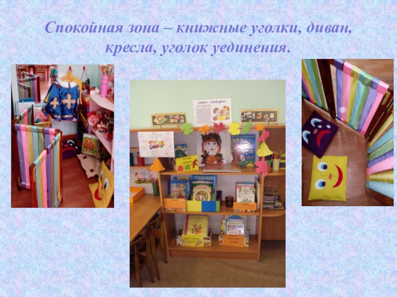 Слайд 18Спокойная зона – книжные уголки, диван, кресла, уголок уединения.