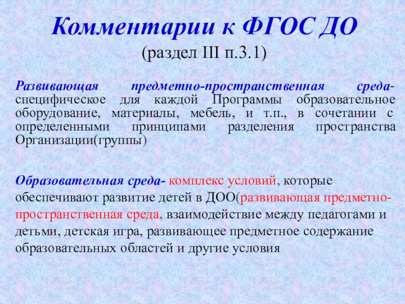 Образовательная среда- комплекс условий, которые обеспечивают развитие детей в ДОО(развивающая предметно-пространственная среда, взаимодействие между педагогами и детьми, детская игра, развивающее предметное содержание образовательных областей и другие условия