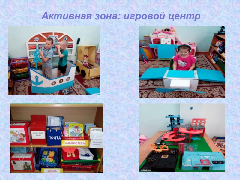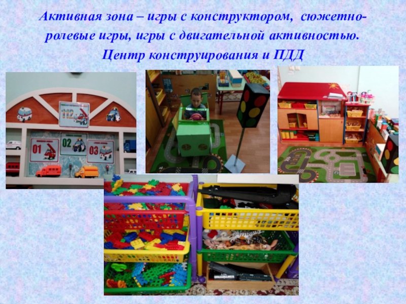 Активная зона – игры с конструктором, сюжетно-ролевые игры, игры с двигательной
