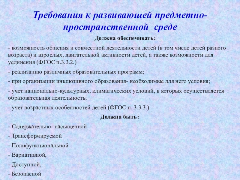 Слайд 4Требования к развивающей предметно-пространственной среде