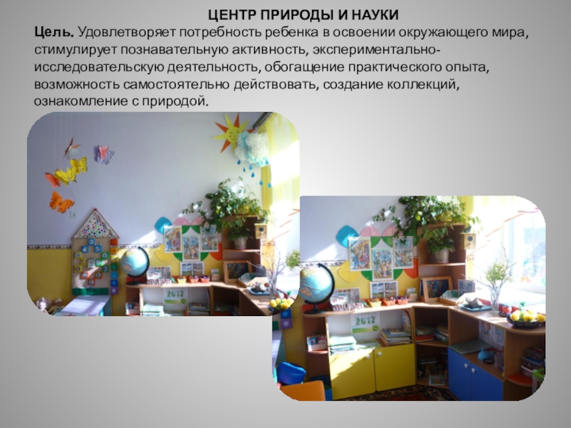 Цель. Удовлетворяет потребность ребенка в освоении окружающего мира, стимулирует познавательную активность, экспериментально- исследовательскую деятельность, обогащение практического опыта, возможность самостоятельно действовать, создание коллекций, ознакомление с природой.