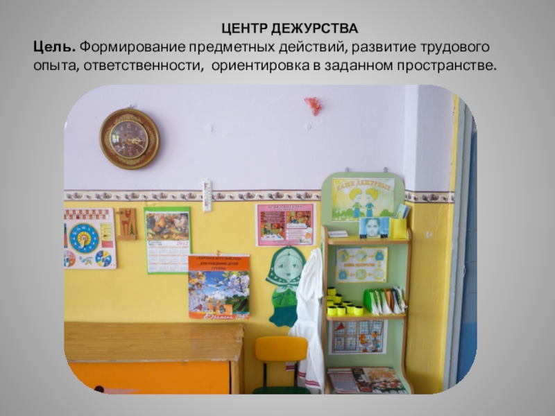 Цель. Формирование предметных действий, развитие трудового опыта, ответственности, ориентировка в заданном пространстве.