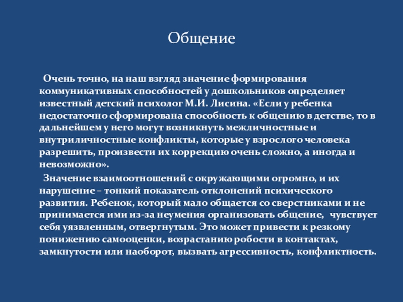 коммуникативных способностей у дошкольников определяет известный детский психолог М.И. Лисина. «Если у ребенка недостаточно сформирована способность к общению в детстве, то в дальнейшем у него могут возникнуть межличностные и внутриличностные конфликты, которые у взрослого человека разрешить, произвести их коррекцию очень сложно, а иногда и невозможно».