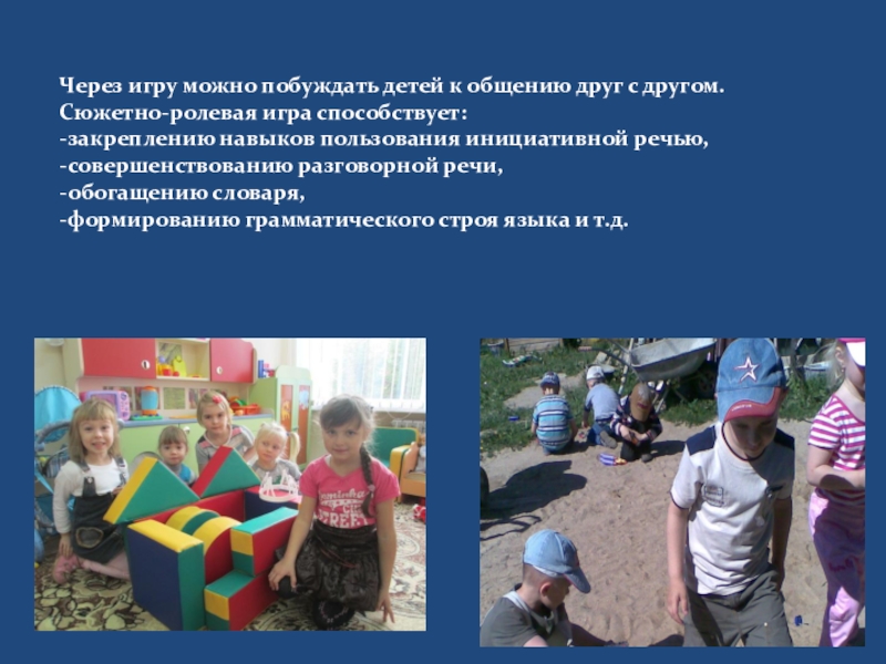 Слайд 12Через игру можно побуждать детей к общению друг с другом. Сюжетно-ролевая