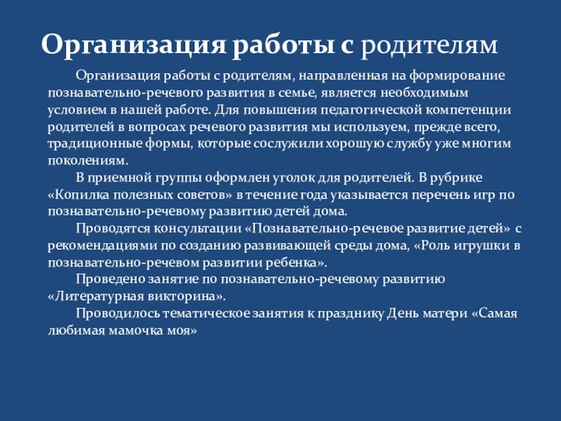 Слайд 18 Организация работы с родителям, направленная на формирование познавательно-речевого развития в семье,