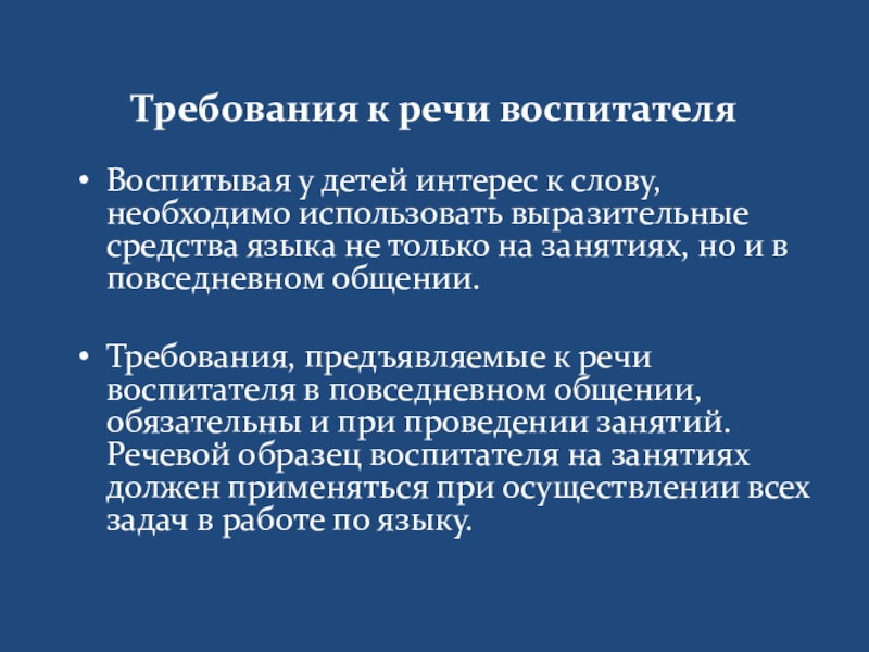 Слайд 9Требования к речи воспитателя