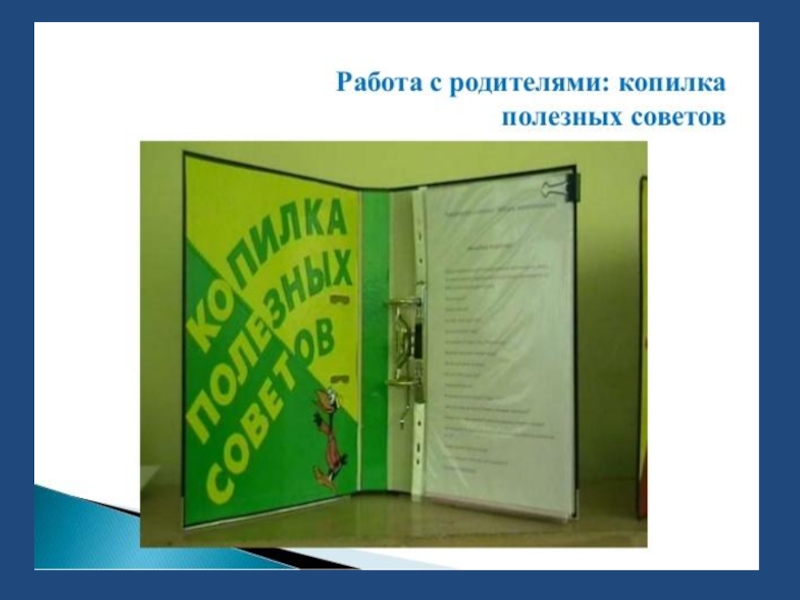 В приемной группы оформлен уголок для родителей. В рубрике «Копилка полезных советов» в течение года указывается перечень игр по познавательно-речевому развитию детей дома.