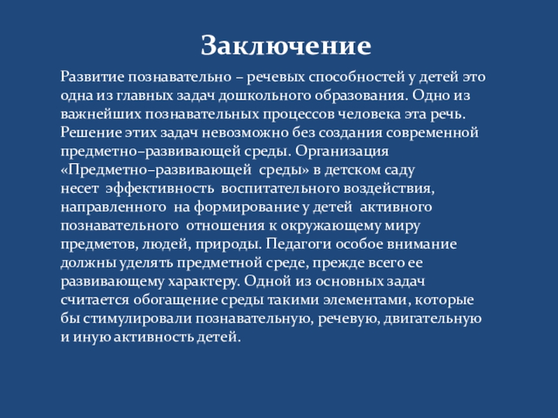 задач дошкольного образования. Одно из важнейших познавательных процессов человека эта речь. Решение этих задач невозможно без создания современной предметно–развивающей среды. Организация «Предметно–развивающей среды» в детском саду несет эффективность воспитательного воздействия, направленного на формирование у детей активного познавательного отношения к окружающему миру предметов, людей, природы. Педагоги особое внимание должны уделять предметной среде, прежде всего ее развивающему характеру. Одной из основных задач считается обогащение среды такими элементами, которые бы стимулировали познавательную, речевую, двигательную и иную активность детей.