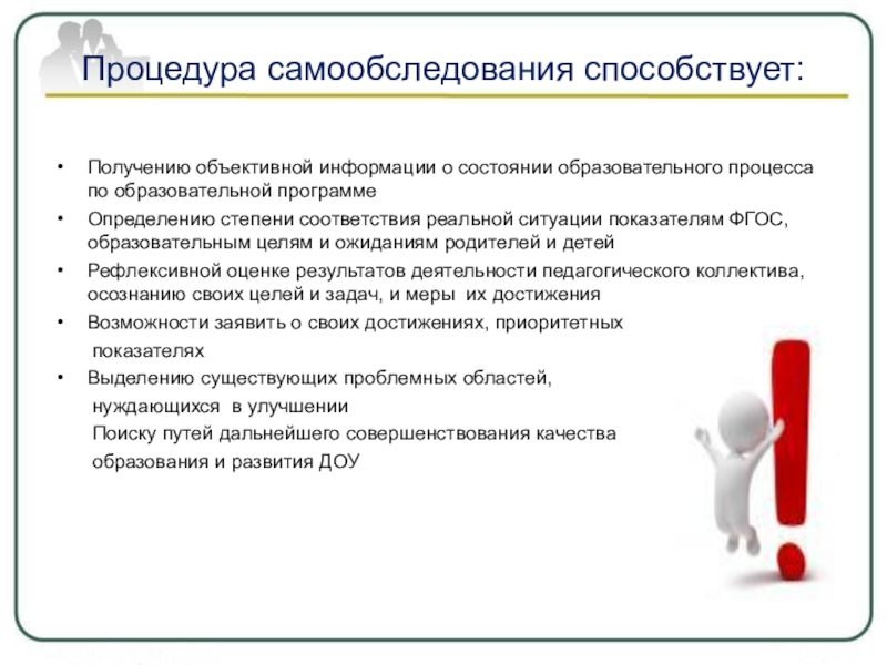 Процедура самообследования способствует: