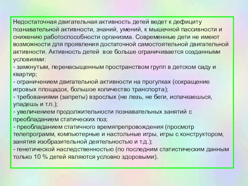 к мышечной пассивности и снижению работоспособности организма. Современные дети не имеют возможности для проявления достаточной самостоятельной двигательной активности. Активность детей все больше ограничивается созданными условиями: