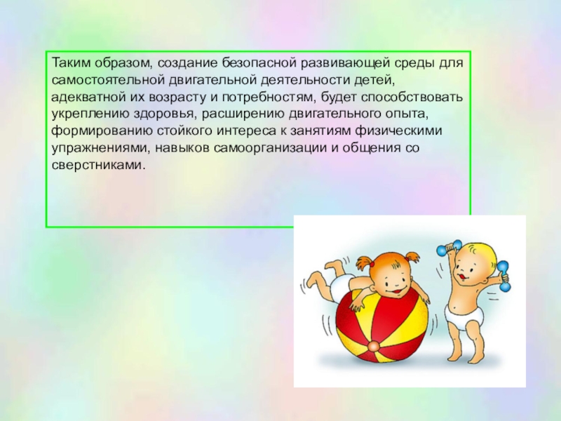 Слайд 22Таким образом, создание безопасной развивающей среды для самостоятельной двигательной деятельности детей,