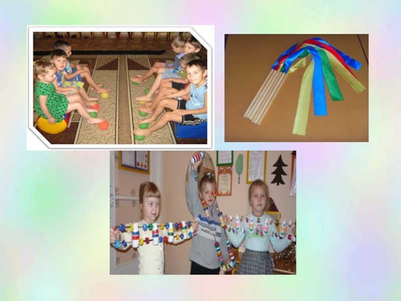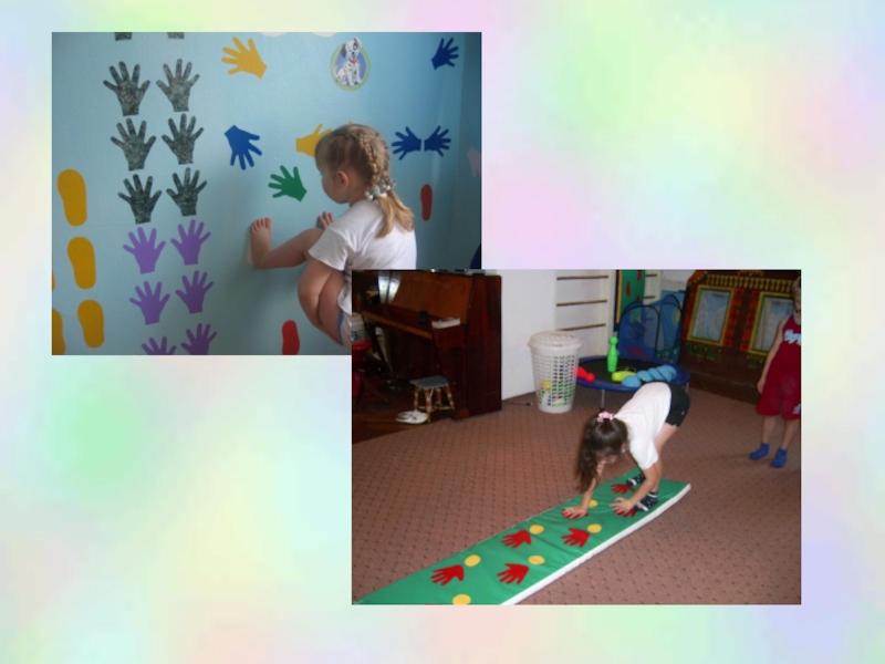 ладошек в различных вариациях от пола и до 1,5м., силуэты ножек от пола и до 70см.; разноцветные полоски (5-10штук) длиной 1-1,50м. для подпрыгивания.