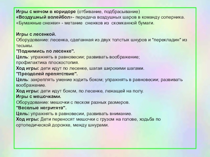 Слайд 20Игры с мячом в коридоре (отбивание, подбрасывание)