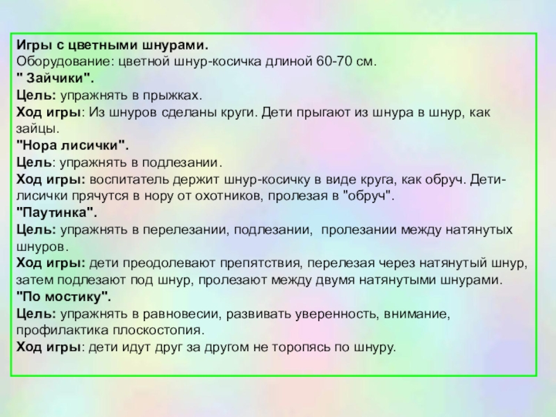 Ход игры: дети преодолевают препятствия, перелезая через натянутый шнур, затем подлезают под шнур, пролезают между двумя натянутыми шнурами.