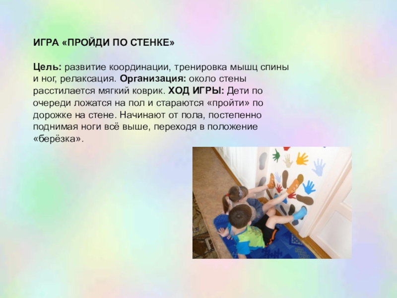 стены расстилается мягкий коврик. ХОД ИГРЫ: Дети по очереди ложатся на пол и стараются «пройти» по дорожке на стене. Начинают от пола, постепенно поднимая ноги всё выше, переходя в положение «берёзка».