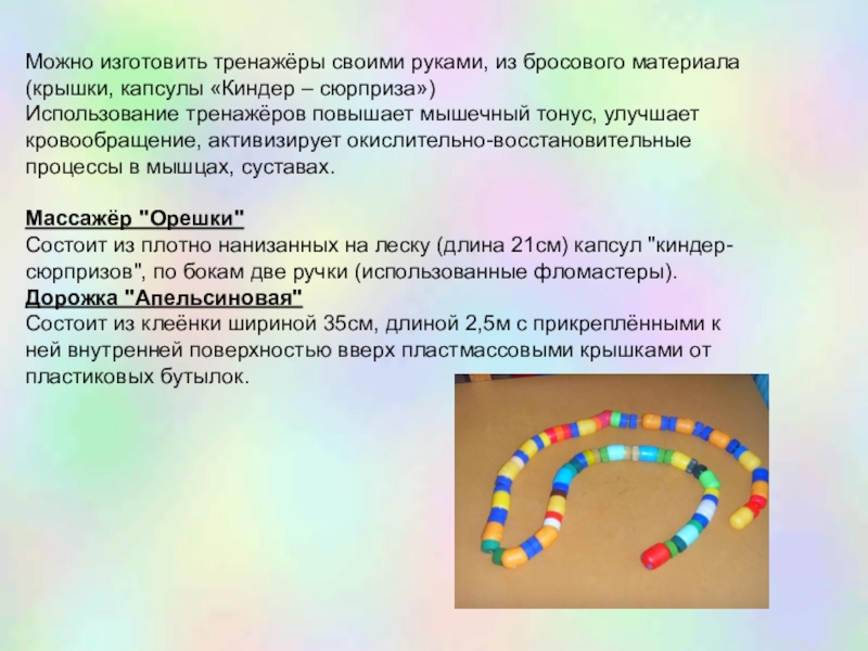 Можно изготовить тренажёры своими руками, из бросового материала (крышки, капсулы «Киндер