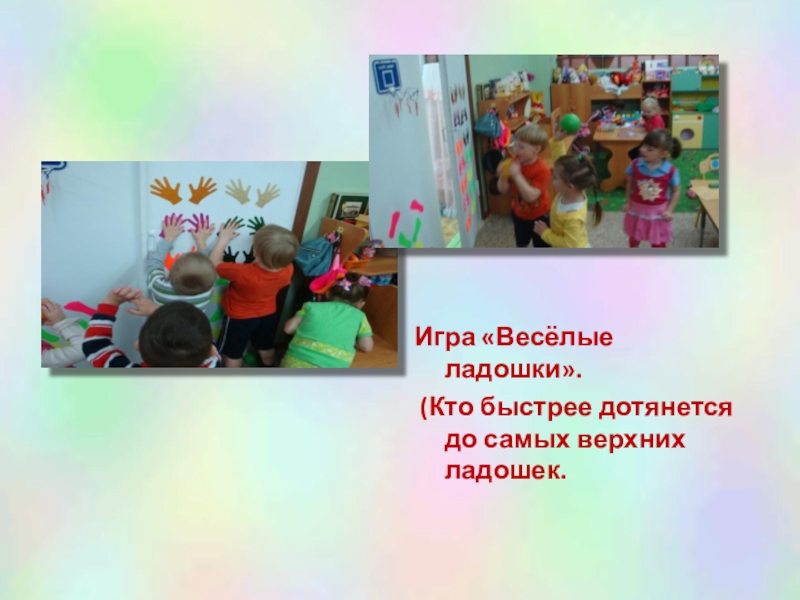 с места в высоту, тренировка стопы. Организация: дети строятся в колонну по одному. Разноцветные полоски наклеиваются на стену на высоте от вытянутой руки самого низкого ребёнка и до высоты прыжка самого рослого. ХОД ИГРЫ:Дети по очереди подпрыгивают у стены, стараясь дотянуться как можно выше до разноцветных полосок.