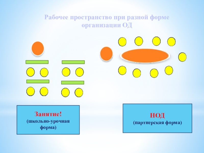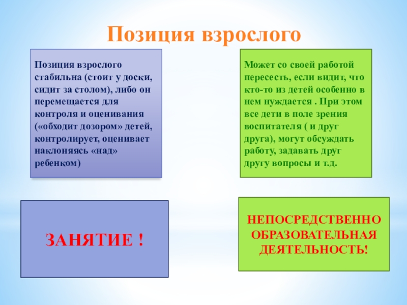Может со своей работой пересесть, если видит, что кто-то из детей особенно в нем нуждается . При этом все дети в поле зрения воспитателя ( и друг друга), могут обсуждать работу, задавать друг другу вопросы и т.д.