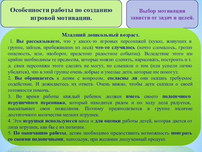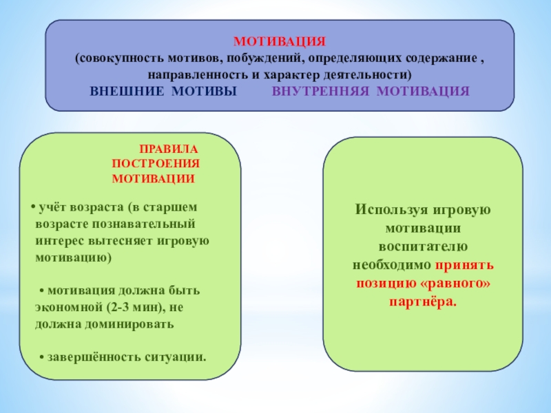 Используя игровую мотивации воспитателю необходимо принять позицию «равного» партнёра.