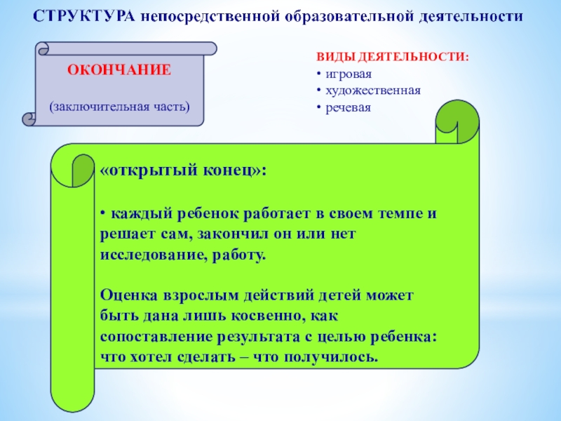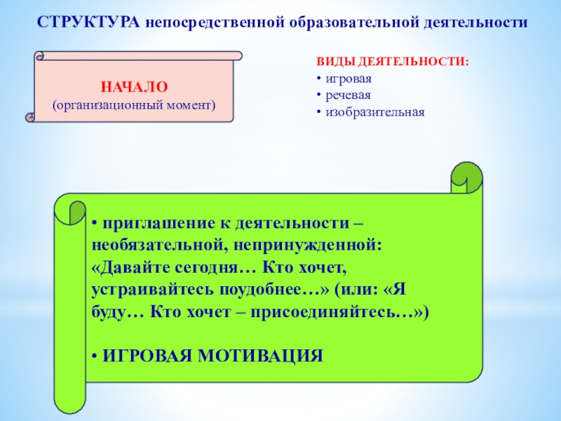 • приглашение к деятельности – необязательной, непринужденной: «Давайте сегодня… Кто хочет, устраивайтесь поудобнее…» (или: «Я буду… Кто хочет – присоединяйтесь…»)