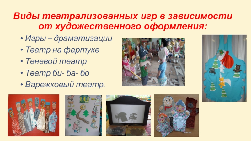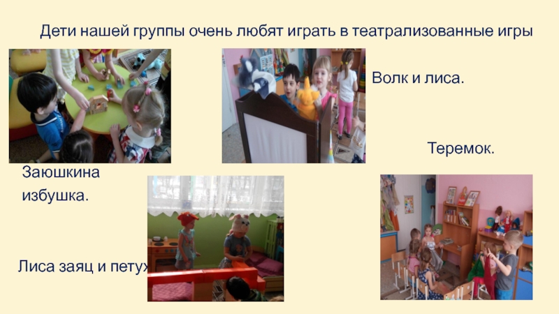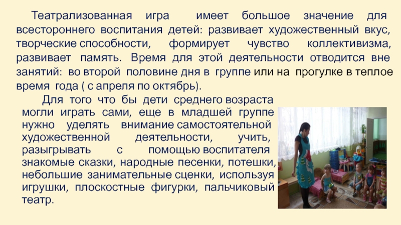 Для того что бы дети среднего возраста могли играть сами, еще в младшей группе нужно уделять внимание самостоятельной художественной деятельности, учить, разыгрывать с помощью воспитателя знакомые сказки, народные песенки, потешки, небольшие занимательные сценки, используя игрушки, плоскостные фигурки, пальчиковый театр.