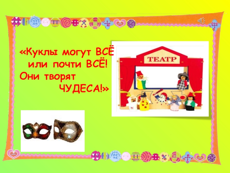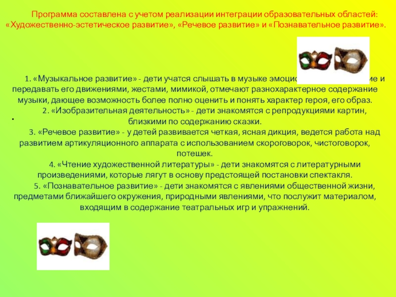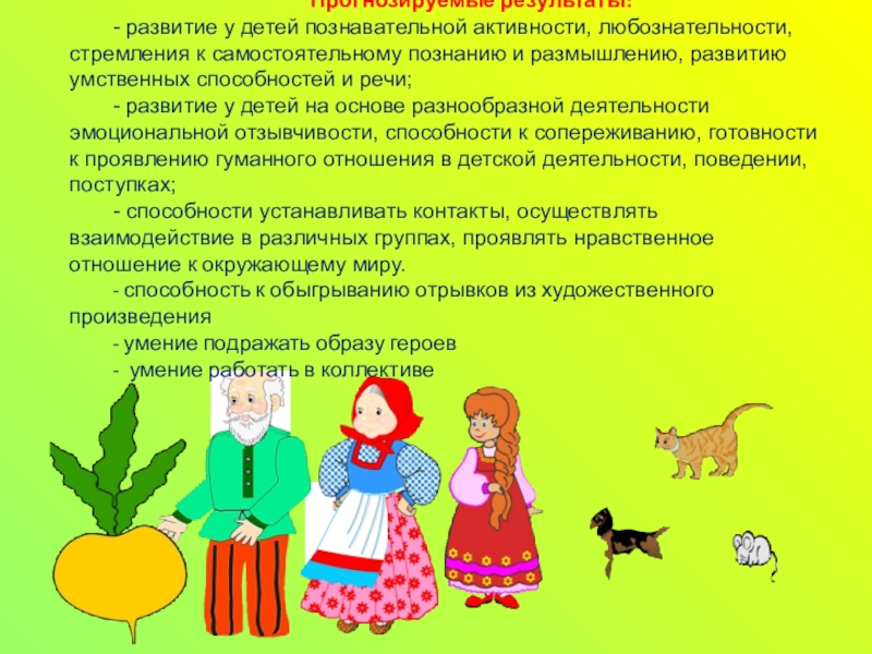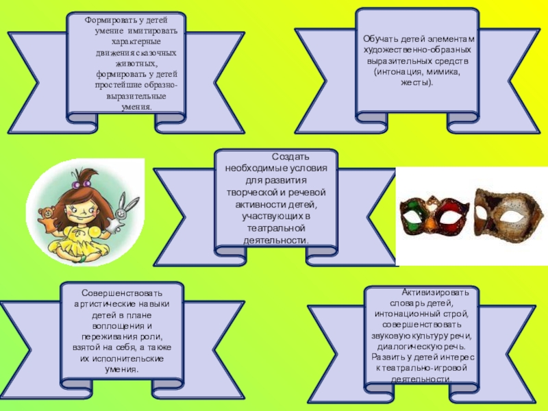Совершенствовать артистические навыки детей в плане воплощения и переживания роли, взятой на себя, а также их исполнительские умения.