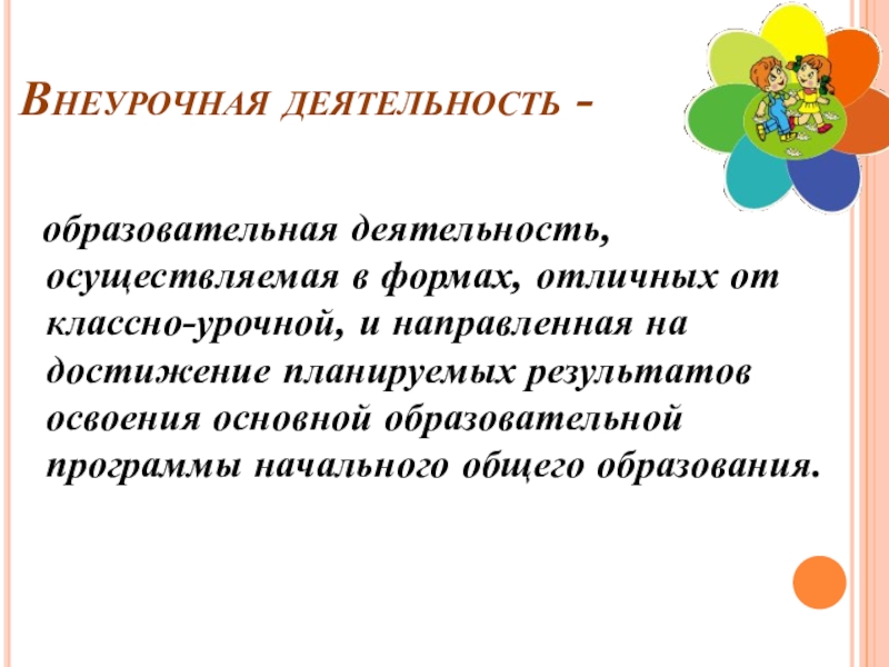 Внеурочная деятельность - образовательная деятельность, осуществляемая в формах, отличных от классно-урочной, и направленная на достижение планируемых результатов освоения основной образовательной программы начального общего образования.